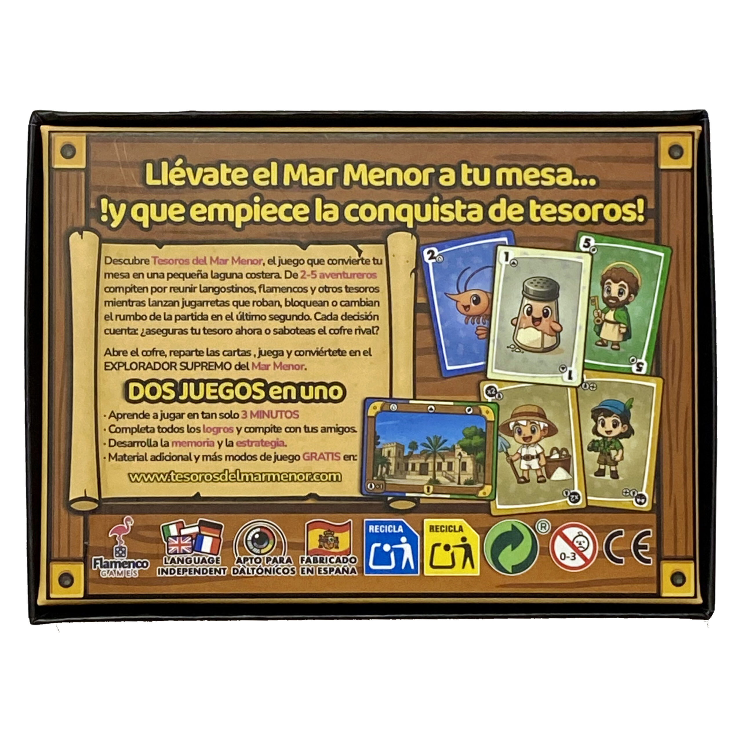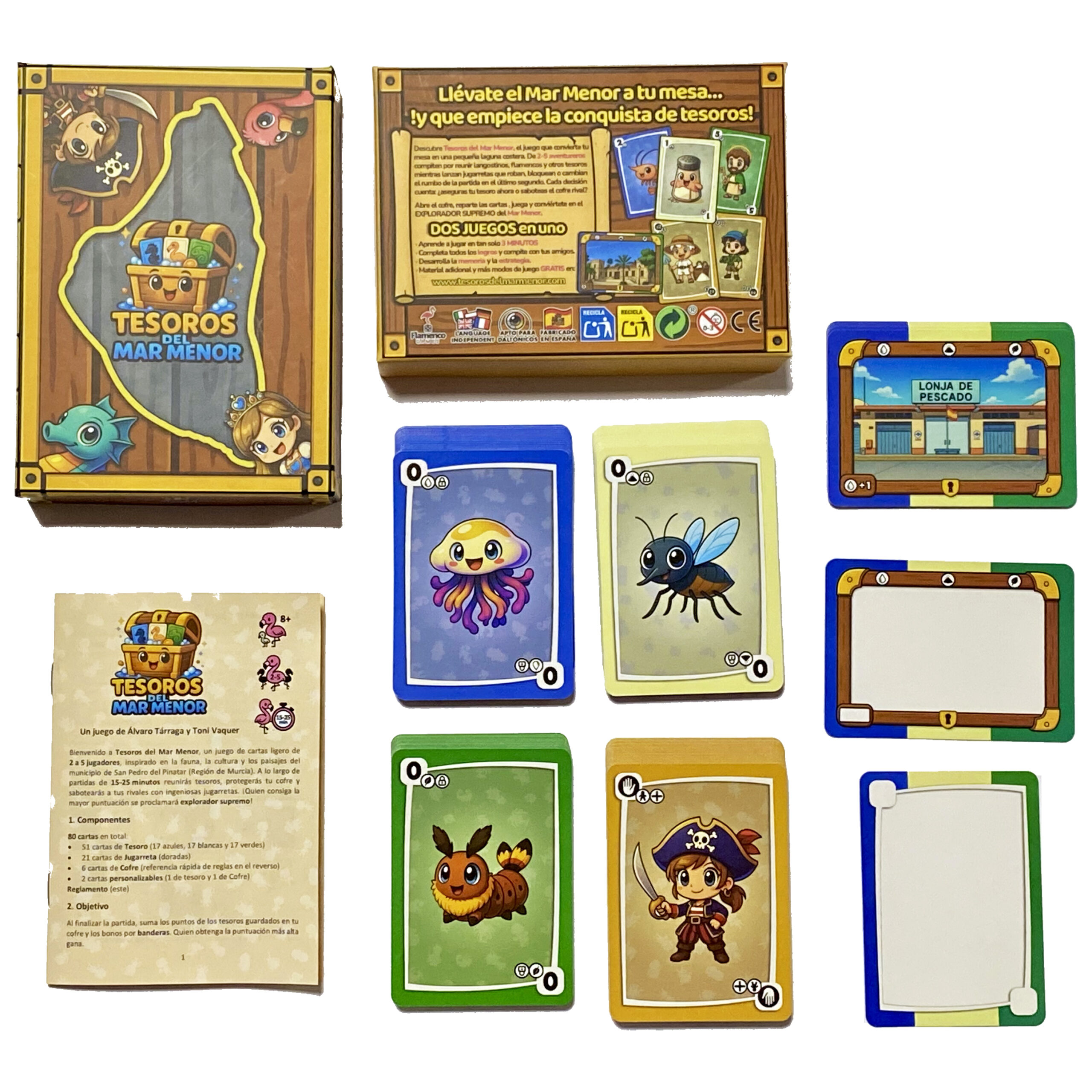 Tesoros del Mar Menor es un juego de cartas familiar para 2–5 jugadores, inspirado en el Mar Menor y el Parque Regional de las Salinas y Arenales de San Pedro del Pinatar. Partidas de 15–25 minutos, reglas sencillas y muchas ilustraciones para descubrir el entorno mientras jugáis.